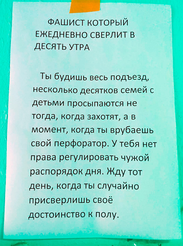 Фашист, возмущается Андрей, просто фашист! В 10 утра будит весь подъезд, сволочь! А ведь весь подъезд - после ночной смены!
