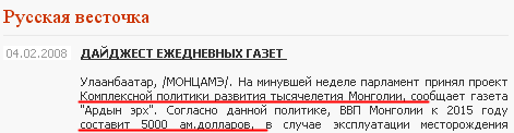 За Монголию мы больше не беспокоимся, обрадовал Виталий. Во-первых, они составили план на ближайшее тысячелетие - а чего мелочиться-то. Во-вторых, на 2015 год запланирован рост ВВП аж до 5000 баксов США, так что где-то к 2925 году следует ожидать ВВП 7243 доллара и 32 цента.
