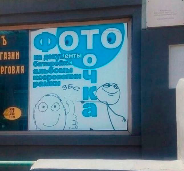 Ну и тут тоже - классный креатив, считает Сладкий пирожок. Слышь, Бивис, они написали "фото очка на документы"!