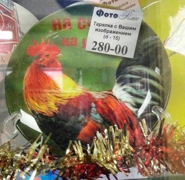 Это в смысле, уточняет Леся, тарелка с вашим изображением, если вы - петух, что ли?
