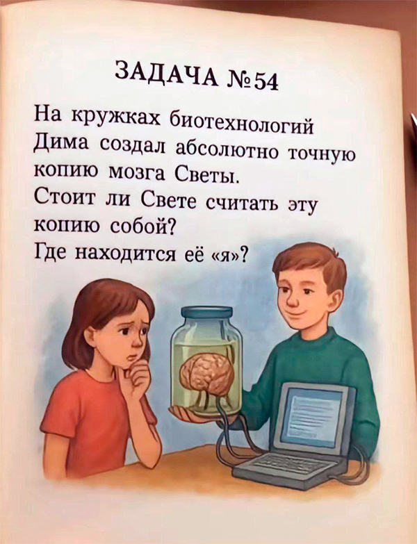 Да хоть из какого. Ведь ответа на это нет. Только мучительные вопросы человечества: что такое личность? чем определяется самость? что вообще лежит в основе мышления? Фантасты пишут на эту тему произведения: полное дублирование человека и встающая при этом проблема идентичности.