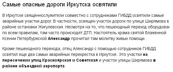 Насчет освященных дорог - смешно, конечно, но это реалии нашей жизни. Причем в нашем городе это еще смешнее подали в местных новостях: "В связи с участившимися авариями руководство ГИБДД приняло решение привлечь православного и мусульманского священников для освящения 15 аварийных участков. Убедившись, что данная мера не подействовала, в ГИБДД приняли решение увеличить освещенность этих мест и установить временные препятствия "лежачий полицейский" с тем, чтобы потом заменить их на стационарные". Т.е. надежда была! И всегда, когда слышу подобное (освящение, установка "противопожарных" хоругвей по периметру поселков и т.п.) думаю: "За чей счёт гуляем?"