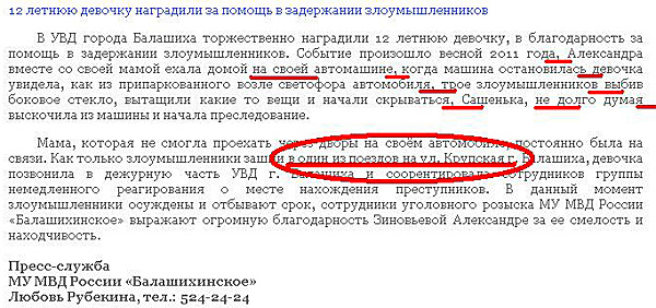 Девочка-то, конечно, молодец, считает Николай, но вот Любовь Рубекину из пресс-службы МУ МВД России "Балашихинское" нужно срочно отправить обратно в школу. Класс в третий. Нет, даже во второй. А лучше вообще - просто отправлять.
