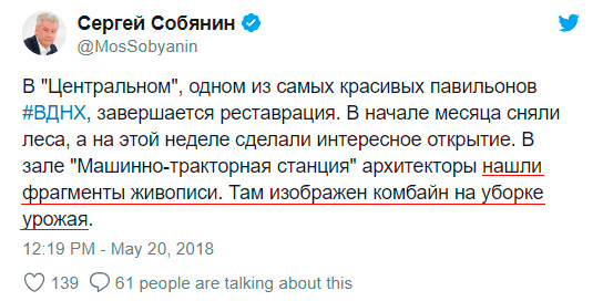 И с центральным павильоном ВДНХ тоже всё в порядке - когда-то стены расписали, позже, когда роспись стала отваливаться - всё закрасили побелкой, теперь вот стали реставрировать - и нашли фрагменты той первой живописи. Почему она должна быть какого-то старинного века - непонятно.