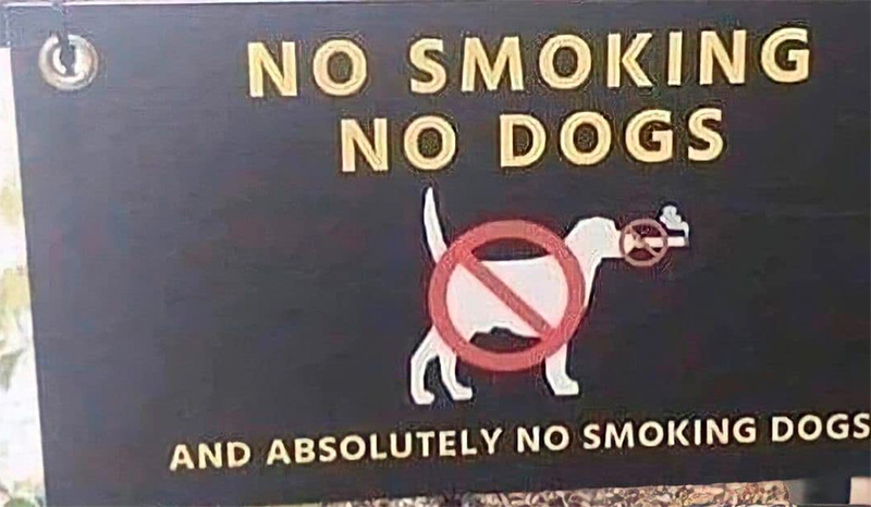 Надпись на плакате: "Не курить. Никаких собак. И абсолютно - никаких курящих собак"!