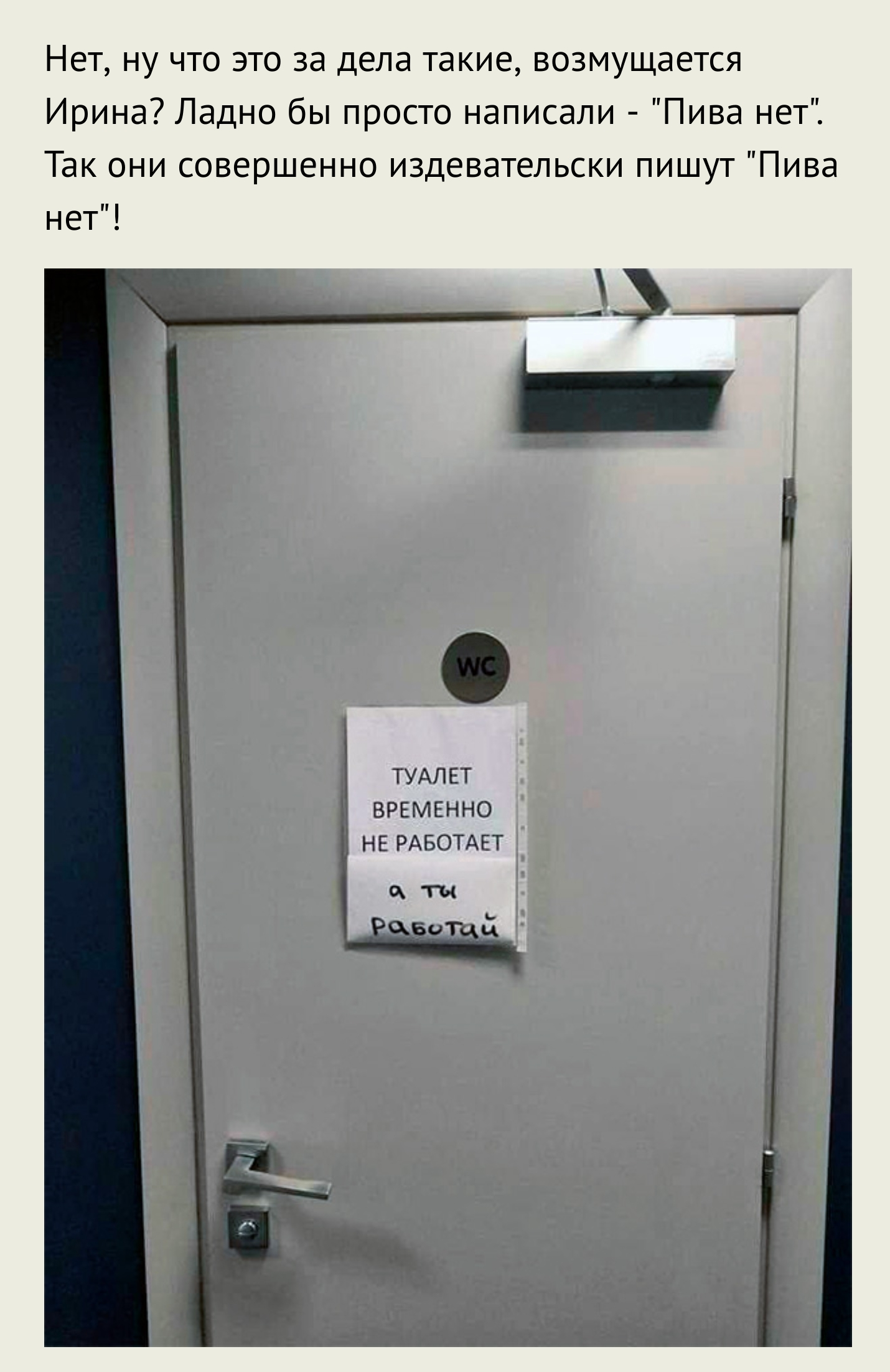 Нет, ну что это за дела такие, возмущается Ирина? Ладно бы просто написали - "Пива нет". Так они совершенно издевательски пишут "Пива нет"!