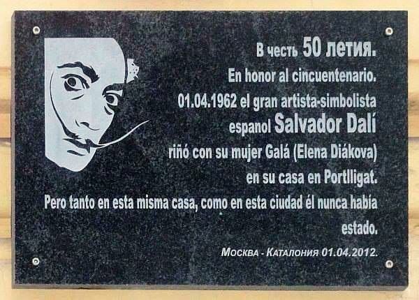 Эта памятная табличка, поведал Алексей, висит в Старопименовском переулке в Москве на доме №15. Надпись на ней гласит: "В честь 50-летия. 01.04.1962 великий испанский художник-символист Сальвадор Дали поссорился со своей женой Галой (Еленой Дьяковой) в их доме в Порт-Льигате. Однако ни в этом доме, ни в этом городе он никогда не был".