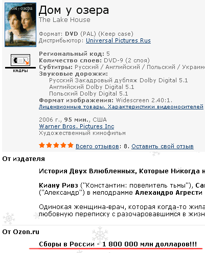 Фильм "Дом у озера", восхищается Akatov и интернет-магазин "Озон", вполне неплохо прокатился в России. 1 800 000 миллионов, то есть почти 2 триллиона, - на эти деньги, пожалуй, можно прикупить что-нибудь стоящее из голливудских актеров. Чтобы они играли за нашу команду.