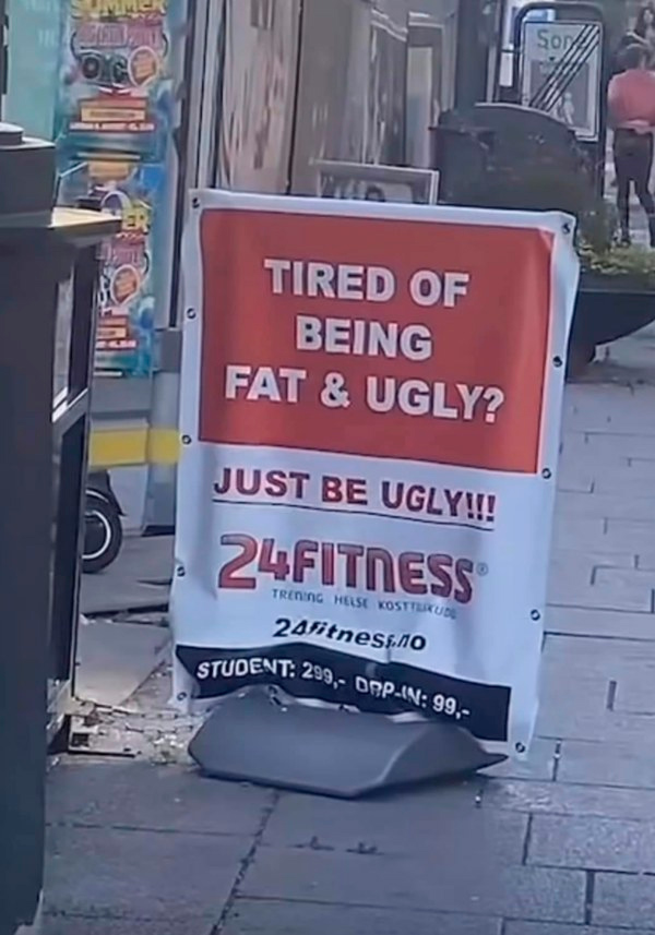 Надпись на рекламе: "Устал быть жирным уродом? Будь просто уродом. Фитнес 24 часа".
