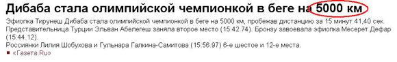 Поражает вооброжение не то, что Дибаба пробежала 5000 км, а то, что пробежала их за 15 с небольшим минут. То есть, не трудно рассчитать, что бежала она со средней скоростью около 20000 км в час, что в 20 раз превышает скорость звука.