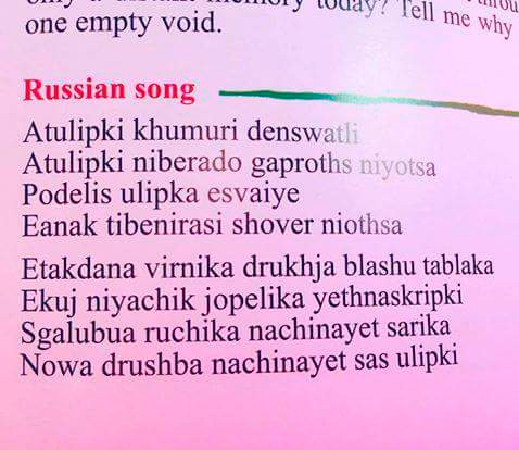 На русской песне завис и пару минут пытался расшифровывать, пока не прочитал последнюю строчку. Интересно, в каком учебном пособии такое напечатали?