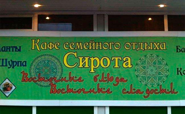 Восточный нейминг, считает Юрий, он также прекрасен. Кафе семейного отдыха "Сирота" - это просто пять баллов!