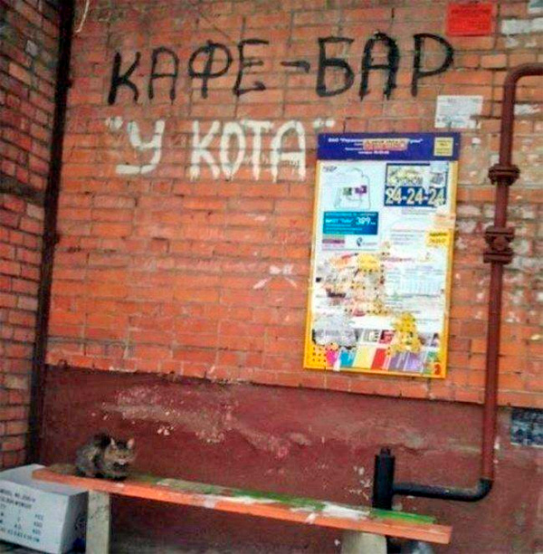 А и действительно. Кот есть? Есть! На лавочку с бутылкой можно присесть? Можно. Все, кафе-бар - у кота! Все честно!
