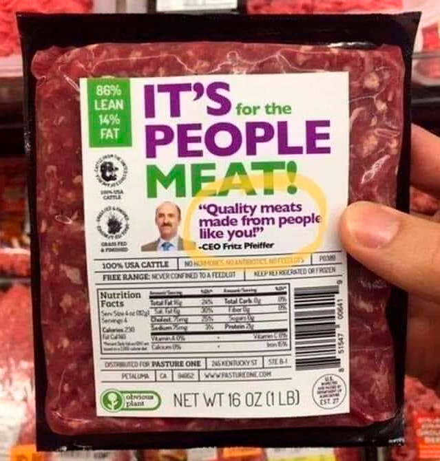 Всего-то одно слово на этикетке перепутали - "from" вместо "for", вздыхает Софья, в результате чего получилось "Качественное мясо, сделанное из людей, как ты".