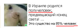 Жэка рассказала о страшном существе, родившемся в Израиле. Это получеловек, который на 85% человек, на 37,5% - козел, а на 243% - рыба. Но не баран, кстати. На 100% баран - новостист, который надудукал эту заметку.