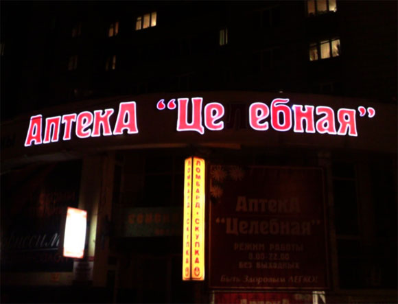 Легкий бросок камня, считает Игорь, и обычная российская аптека внезапно меняет название на украинское, резко выходя при этом из рамок приличия.