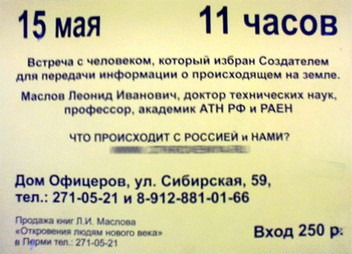 В Перми, рассказал Bearserg, выступает очередной посланник Создателя. Предыдущего за жульничество посадили (правда, сейчас вроде выпускают), так теперь новый посланник нарисовался.