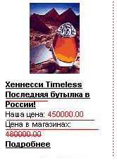Срочно покупаем "Хеннеси Timeless", рекомендует Чижиков А.Ю. Это самая последняя бутылка в России! Причем цена значительно снижена по сравнению с обычной суммой, за которую данную бутыль можно приобрести в магазинах и ларьках.