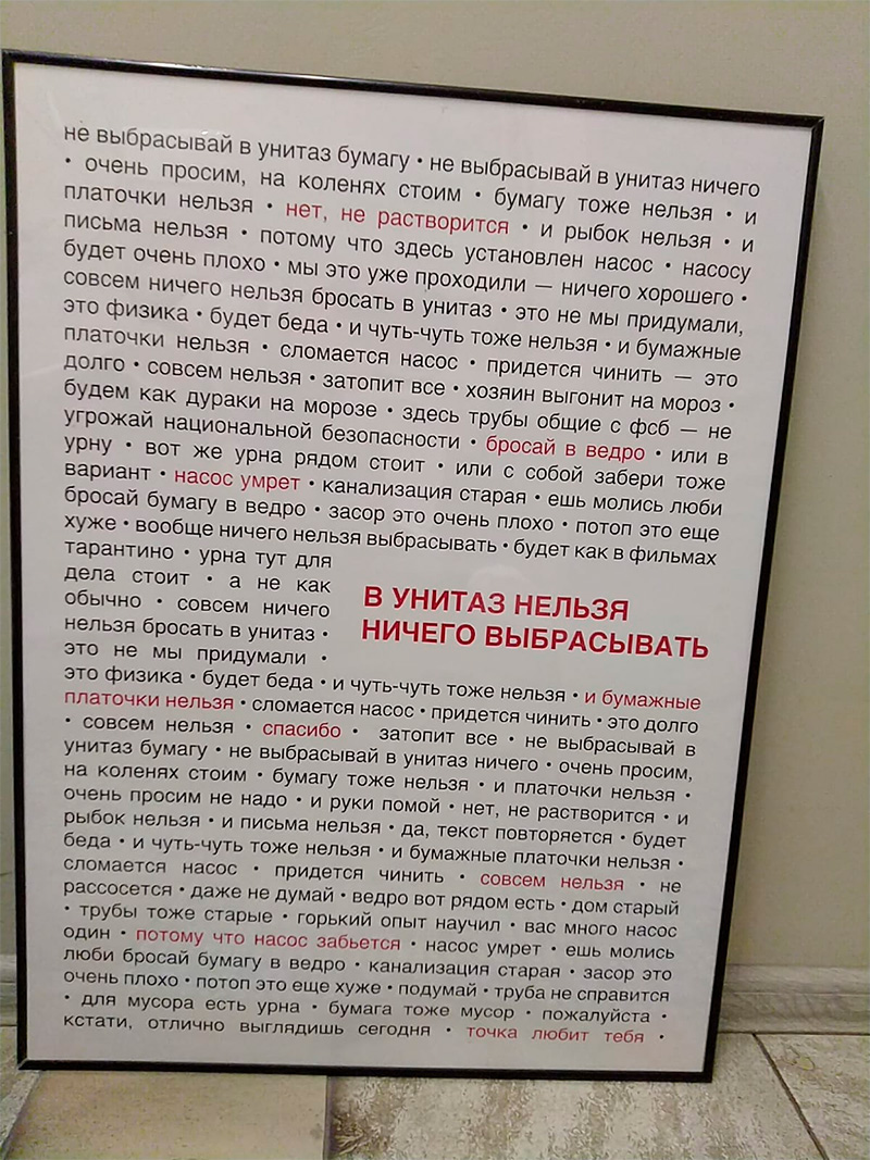 Насчёт унитаза и что туда нельзя бросать. Самое лучшее из известных мне объявлений на этот счёт звучит так: