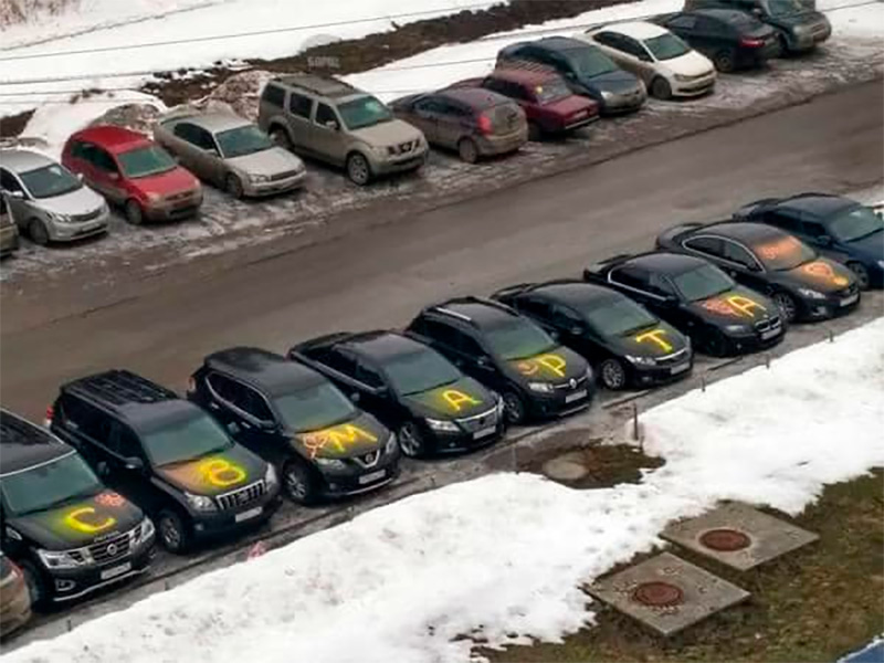 Подозреваю, что это коллеги-мужчины поздравили женщин, работающих с ними в одном офисе, под окнами которого и была организована эта "выставка". Машины служебные (поэтому одного цвета), а буквы, скорее всего, на прозрачной липкой основе, типа стикеров.