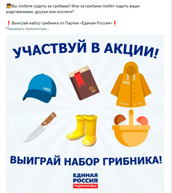 Грибникам Подмосковья партия "Единая Россия" предлагает выиграть "набор грибника". Куда входят бейсболка, книга речей Путина, чукотская национальная одежда, нож, резиновые сапоги и корзина с грибами. Вот от корзины с грибами мы бы с Бубликом не отказались, хотя, впрочем, от "Единой России" они наверняка будут червивыми, а половину грибов они наверняка сопрут.