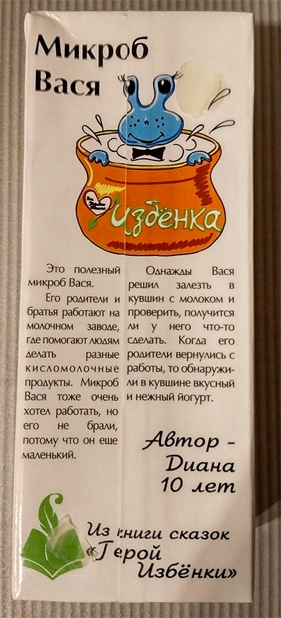 Эльдар приобрел для ребенка кефир "Избенка". Эта "Избенка" еще и выпускает книгу сказок "Герой Избенки", каковые сказки они лепят на свои продукты. Так вот, Эльдар сильно недоумевает, почему микроб Петя из рассказа Григория Остера превратился в микроба Васю, а главное - почему уважаемый Георгий Остер вдруг превратился в Диану десяти лет. Судя по всему, в этой "Избенке" маркетологи слегка обнаглели.