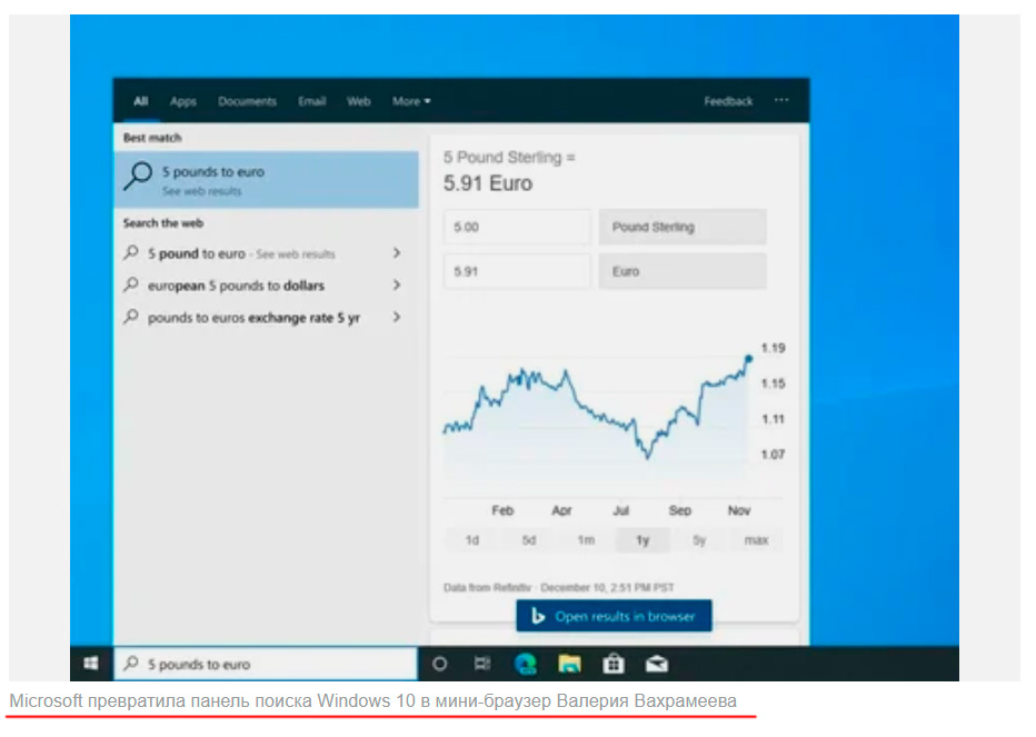 Юрий с отличной новостью прямо с официального сайта Miscrosoft! Оказывается, компания превратила панель поиска в мини-браузер Валерия Вахрамеева! Наши поздравления Валерию Вахрамееву!