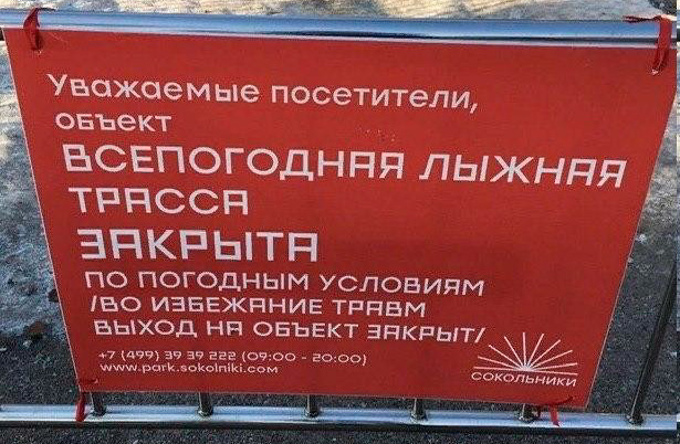 Про лыжню:Так просто снега нет на лыжне, потому и закрыта.скорее там сплошной лёд, судя по надписи пор травмы