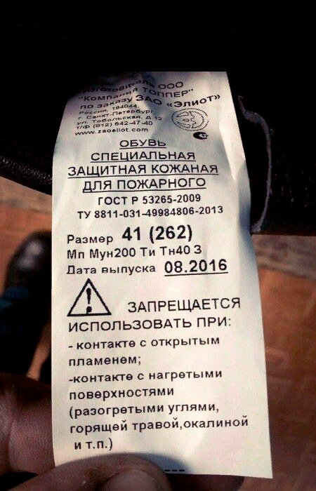 Вот такая специальная защитная обувь для пожарного. На пожаре, конечно, ее использовать запрещается, а как иначе?