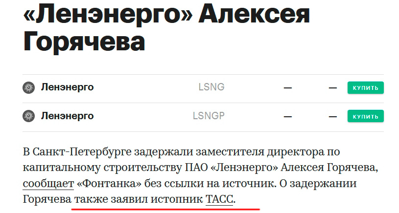 Слушайте, ну, что в "ТАСС" есть свой истопник - оно как-то неудивительно, погода до сих пор, что называется, шепчет. Но вот с какого такого счастья он делает какие-то заявления - непонятно совершенно... А-а-а-а-а, понял. "Ленэнерго" Алексея Горячева сам истопник и задержал!