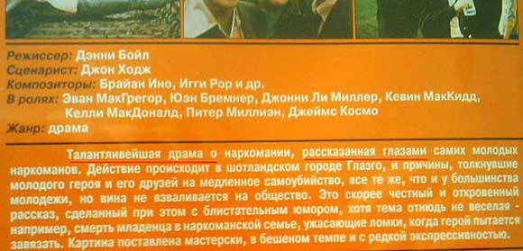 На редкость убогая аннотация к фильму Trainspotting. Все знают, что действие фильма происходит в Эдинбурге, а не Глазго. Who the heck is Iggy Ror? И последнее предложение тоже ничего так, "подъезжая к сией станцыи и глядя на природу в окно, у меня слетела шляпа".