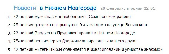С новостями НН мне еще повезло, получается: когда я видела эту подборку (дня три назад), нижняя строчка была какая-то нейтральная, типа, "Завтра в НН ожидается снег с дождем".