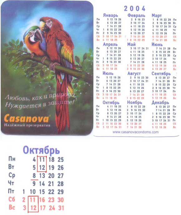 Этот календарик, сокрушается Корчагин Павел Павлович, рекламирует "надежный презерватив". Остается задуматься: настолько же данный презерватив надежен, как и даты календаря? С октябрем там совсем нелады - 6 и 7 числа куда-то пропали, зато 11 и 12 размножились. Впрочем, вероятно, это какой-то тайный знак, указывающий на способ применения презерватива Casanova...