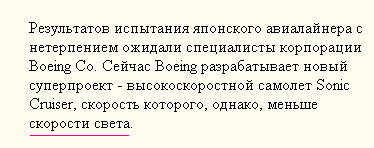 Вот это облом так облом! И нафига делали новый самолет, спрашивается, если эта бандура летает со скоростью, меньшей скорости света, а? Это же смех один! Над ними все смеяться будут. Самолет летит, а народ показывает пальцами и говорит: "Вы посмотрите только на это дурацкий Круизер! Он даже луч Солнца не может догнать, высокоскоростной называется!" И какого это будет слышать японским конструкторам? Одно расстройство.