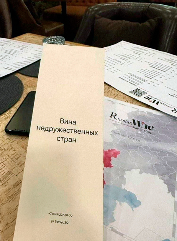 В ресторане на "Балчуг" в Замоскоречье, рассказал Свинодел, обнаружена отдельная карта с винами недружественных стран. Как по секрету рассказали в ресторане, вина из недружественных стран пользуются значительно большей популярностью, чем вина из Ирана, Эритреи, Венесуэлы и Пакистана.