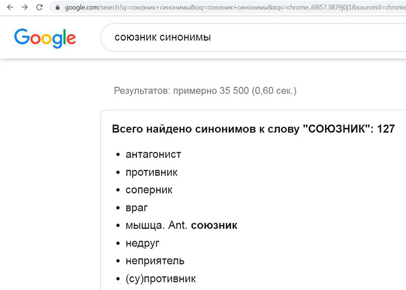 "Гугл" совершенно серьезно считает все эти слова синонимами слова "союзник", удивляется Андрей.