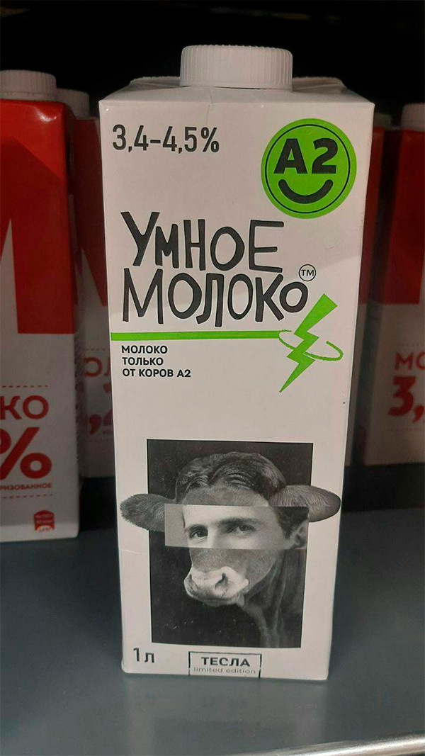 В смысле, "Тесла"? Это ученый, и фрагмент его портрета помещен на корову. Там, я понимаю, целая коллекция с разными известными людьми прошлого. С их сайта: