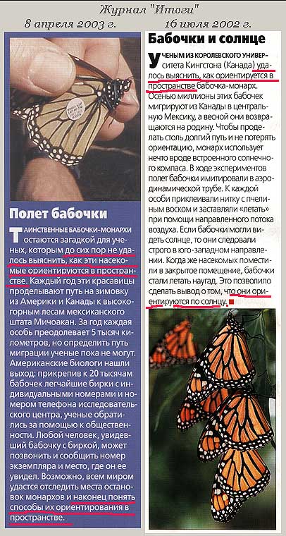 Вот такой он, Alexey, привередливый. А я должен защитить ученых! Может быть, они 17 июля 2002 года так напились (говорят, у ученых это бывает), что начисто забыли, каким местом ориентируются в пространстве бабочки-монарха! Бывает же такое, правильно? Некоторые ученые, после банкетов, имя свое вспомнить не могут, а не то что пути миграций каких-то бабочек... Так что Alexey придирается, однозначно!
