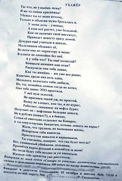 П. Кожев прислал чУдные стихи, принадлежащие шкодливому перу кандидата в депутаты г. Жуковского товарища Сидахметова. Прошу приветствовать... Этот шедевр был отпечатан в количестве 500 экземпляров на скромные народные сбережения товарища Сидахметова и расклеен на дверях и заборах в качестве примера политической сатиры, облаченной в форму высокого искусства.
