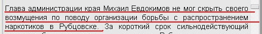 "И действительно, - сказал губернатор. - Столько лет в Рубцовске все было тихо и спокойно, люди были всем довольны, радовались, как дети, пролетающим стадам бегемотов и весеннему гону северных оленей, а тут вдруг организовали борьбу с распространением наркотиков! Так как жить теперь людЯм, как? - риторически спросил губернатор."