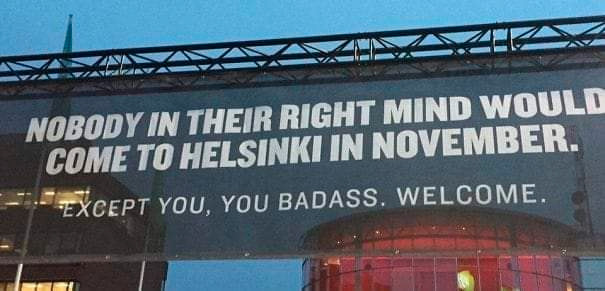Вот такой классный плакат встречает прибывших в Хельсинки в ноябре, рассказала Настя. Надпись на плакате: "Никто в здравом уме не приедет в Хельсинки в ноябре. Кроме тебя, крутой. Добро пожаловать!"
