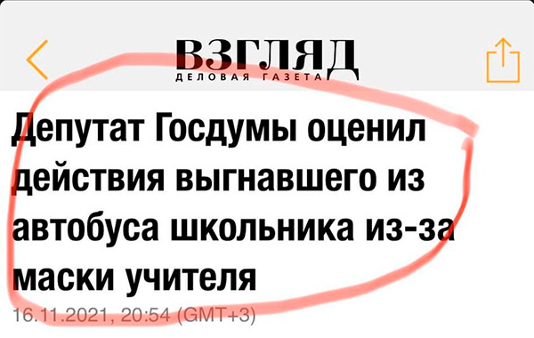 В очень деловой газете "Взгляд", рассказала Александра, заголовки к новостям пишут вообще не приходя в сознание. Школьник выгнал из автобуса учителя из-за маски?