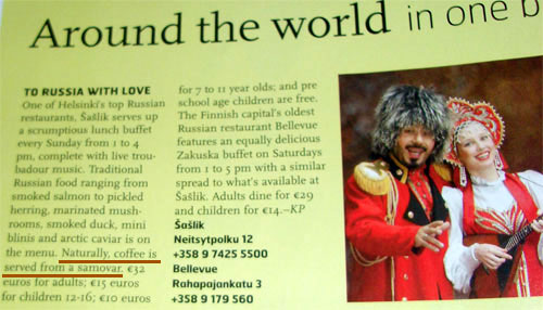 Во-первых, его радует "типично русский казак" на картинке, изрядно смахивающий на Киркорова. Во-вторых, ресторан русской кухни имеет типично русское название "Шашлык". Ну и в-третьих, после завлекающей рекламной фразы "Разумеется, кофе на стол подается исключительно из самовара" Владислав понимает, что он не сможет не посетить это прелестное заведение.