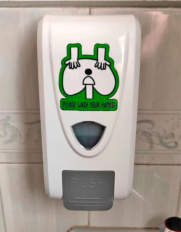 Дима пытается понять, что дизайнер хотел сказать этим дозатором... Мы с Бубликом считаем, что ни к чему тут вдаваться в психоанализ, ни к чему совершенно!