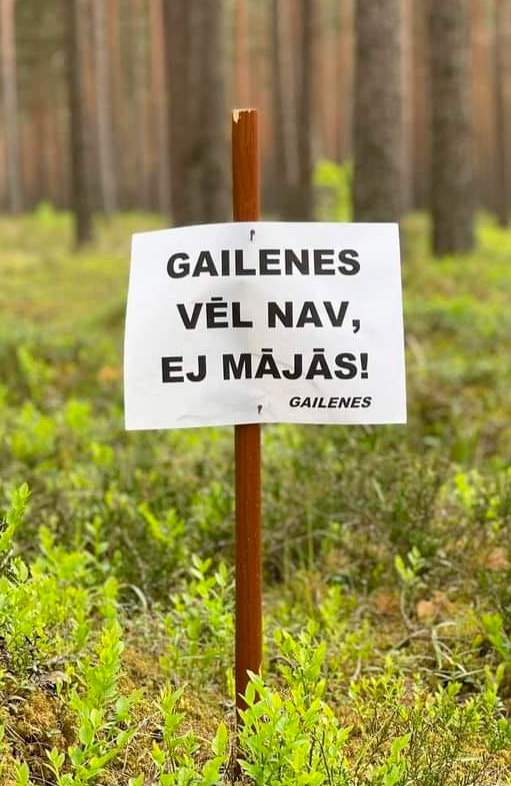 Надпись на плакате на латышском: "Лисичек еще нет, идите домой". Подпись - "Лисички".