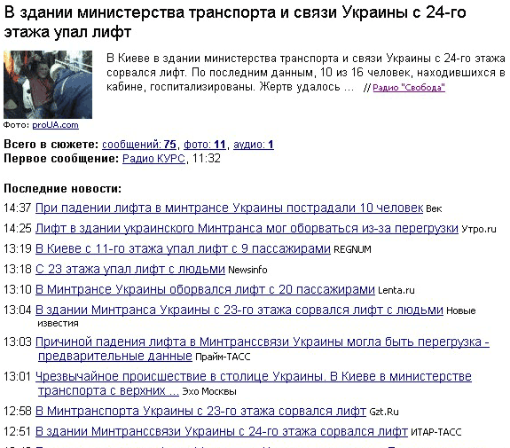 Только с помощью "Яндекс.Новости", замечает Serafim, вы сможете получить совершенно достоверную информацию о том, как в этот день лифт падал с 11, 20, 23 и 24-го этажа. При этом в нем было 9 человек, 10, 16 и 20.