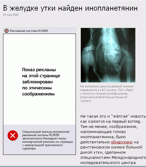 Как трогательно, умиляется Лариса Морожникова, что именно на этой странице умная система RORER заблокировала показ рекламы. Из уважения к инопланетянину, случайно попавшему в желудок к дикой утке. Трогательно. Очень трогательно.