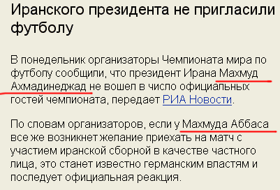 Впрочем, тут нет никакой путаницы. Махмуд Ахмадинеджад не вошел в число официальных гостей, а если у Махмуда Аббаса возникнет желание приехать, то Махмуд Отар-Мухтаров напишет по этому поводу прелестные стихи.