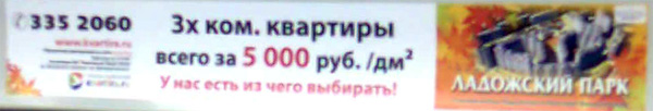 Всего 5 тыров за квадратный дециметр. В одном метре этих дециметров - 10х10, то есть сотня, так что стоимость составляет полмиллиона или $16 тысяч за квадратный метр. Ладожский парк! Побалуй себя дешевыми квартирками! Налетай, пацаны!