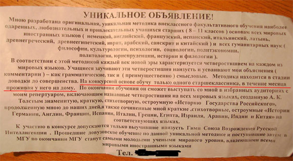 Марина С. сфотографировала объявление очередного выдающегося феномена. Особенно умиляет подчеркнутая строчка.